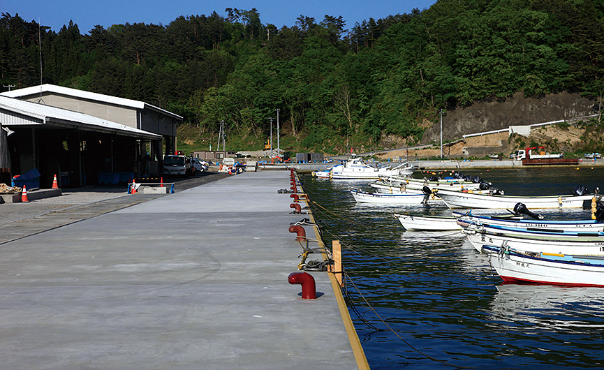 瓦礫こそ撤去されたものの、流された家の基礎がそのまま残るなど、津波の爪痕が生々しく残る田老の町ですが、田老漁港には数多くの重機が入り、岸壁のコンクリートを打ち直すなど、土木作業のただ中にあります。まだ岸壁に横付けすることはできず、沖泊めを余儀なくされているものの、眩いばかりの新造船がズラリと並ぶその光景は復興への息吹を感じさせます。