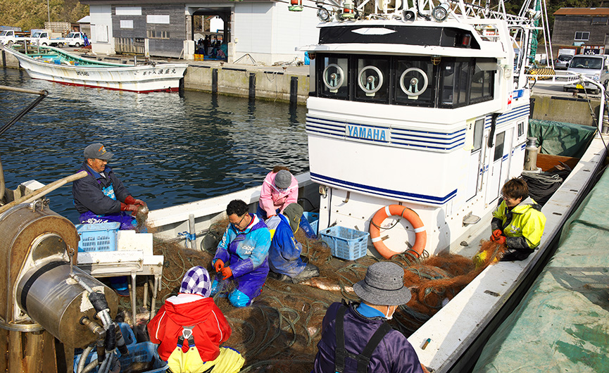白神山地から日が昇りきったころ、港に戻ると、一男さんと貴彦さんの奥様も加わり、刺網から魚を外し箱に詰めて出荷するという、家族総出の作業に移ります。