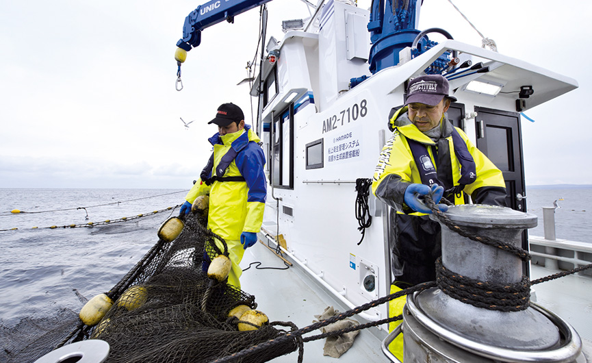 対岸に北海道を望む津軽海峡に面した青森県むつ市の大畑町では、3軒の経営体によって小型定置網漁業が行われています。