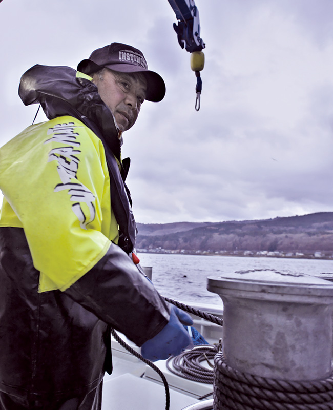 大畑漁港に浮かぶ他の定置網漁船とひと目で違いがわかるのは、艫に追加設置されたクレーン。