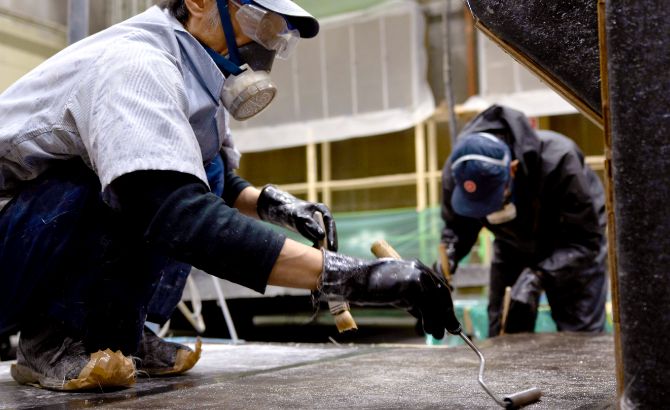 ポリエステル樹脂とガラス繊維を型に張り付けパーツを作り、整形されたパーツのバリ取り、組み立て、磨き上げを行います。