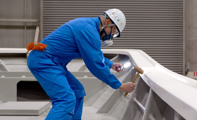 FRP成型の職場では、各パーツを作り、組立職場で組み立てて仕上げるまで、幅広い業務に携わります。
